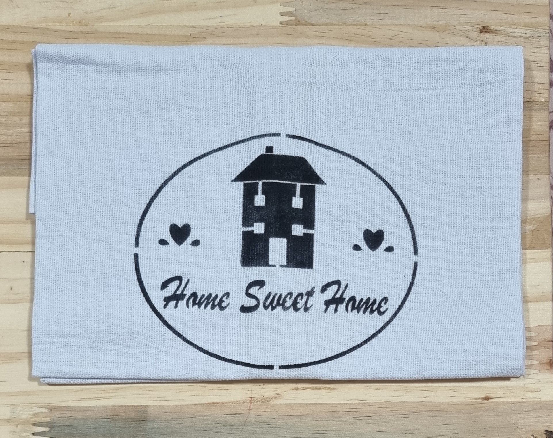 Pano de copa SM-08 branco com estampado artesanalmente com stencil e tinta na cor preto, sem acabamento nas barras, com acabamento nas laterais.