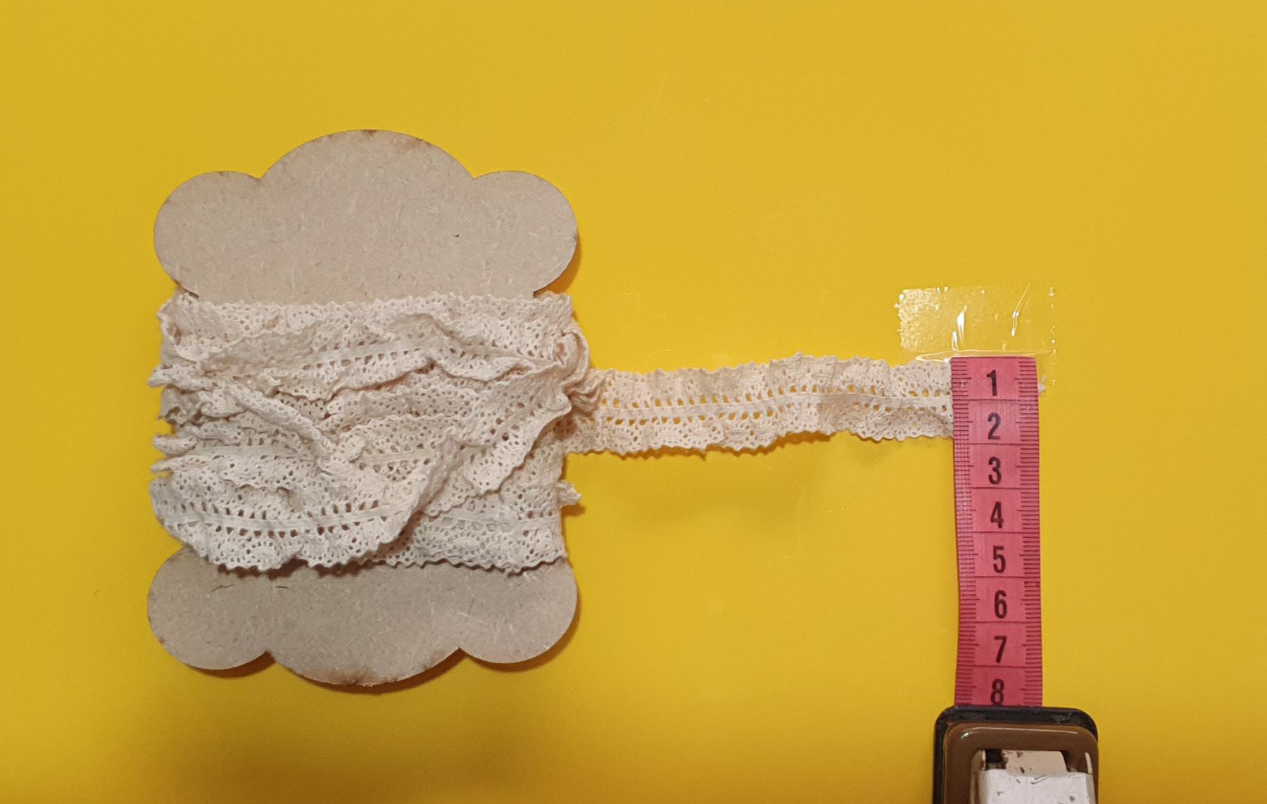 Renda franzida dw algodão cor bege com elástico no meio de 2cm de altura - com 3 metros mais 1 placa em MDF em forma de carretel