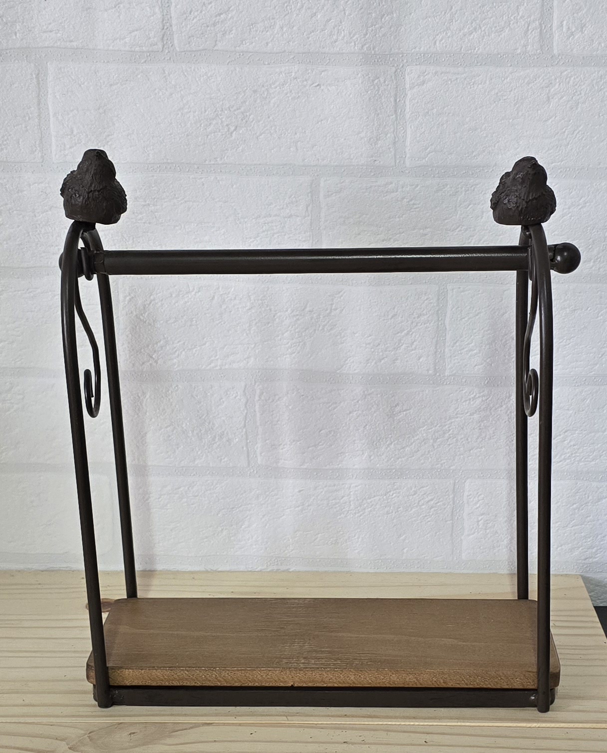 Suporte de mesa em ferro, base de madeira e 2 passarinhos em resina marrom.